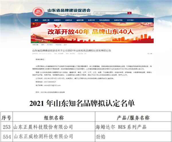 近日,山东省品牌建设促进会公布了2021年山东知名品牌拟认定名单,乐动(中国)科技HAMDELL/海姆达尔(BES系列产品)品牌、权属单位正威检测劲焰品牌凭借过硬的实力和强大的品牌影响力双双登榜。