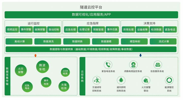 基于新一代信息技术,将云计算、大数据、视觉A1、高精度地图和定位、交通优化算法与物联网、互联网技术有机结合,构建智能管养、自动决策、信息发布、应急指挥于一体化的云控平台,形成围绕“感知、分析、预警、决策、控制”的业务闭环,提升集中控制、异常识别、应急处置的综合能力,实现隧道运营管理“可视、可测、可控、可服务”。